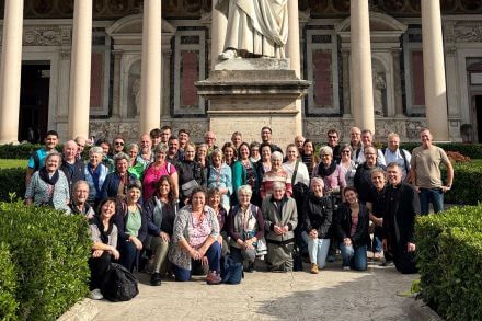 Am letzten Tag führt uns Frater Simon Bailoni „in die Tiefe“, d.h. in die unterirdischen Grabstätten der ersten Christen Roms, Katakomben genannt. Am ersten Romtag hatten wir ihn und seine Brüder und Schwestern im Collegium Paulinum, dem Ausbildungshaus der geistlichen Familie des Werkes besucht. Er ist auf dem Weg zum gottgeweihten Priestertum. Es waren Tage voller Eindrücke mit vielen Informationen über Vergangenheit und Gegenwart, Tage des Gebetes und der Stärkung im Glauben, Tage der frohen Gemeinschaft, einfach unvergessliche Tage. Papst Leo hat uns folgende Worte mit auf den Weg gegeben: „Das Gebet hat die Kraft, unsere Einstellungen, unsere Gedanken, unsere Worte und unsere Taten zu verändern.“