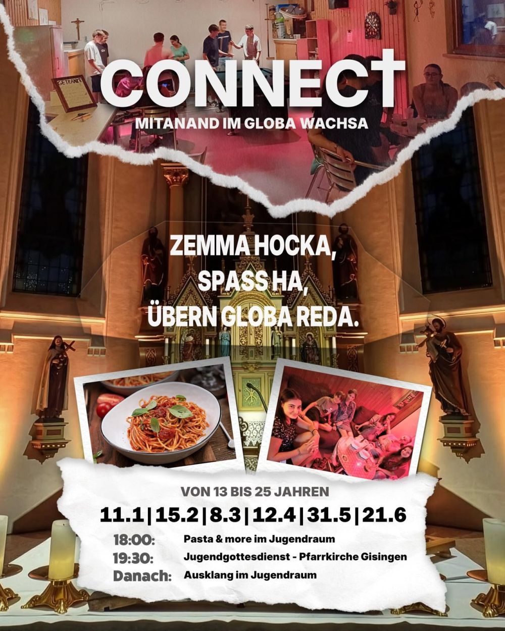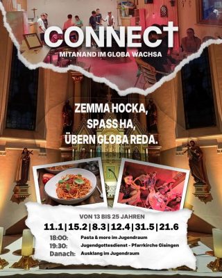 So. 12. April: Connect – Treffpunkt der JugendPosted on26. März 202623. März 2026CategoriesAnkündigungen u. EinladungenCONNECT – JUGENDABEND18.00 Pasta & more im Jugendraum, 19.30 Uhr Jugendgottesdienst – Pfarrkirche GisingenDanach: Ausklang im Jugendraum